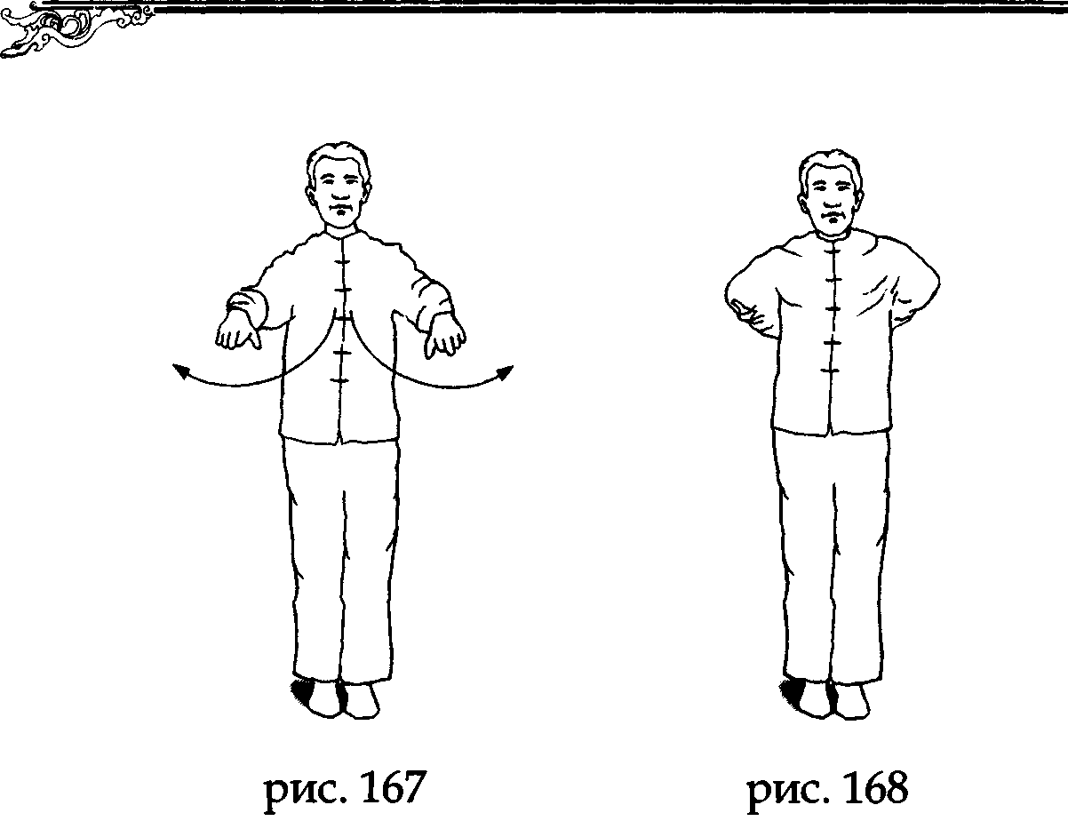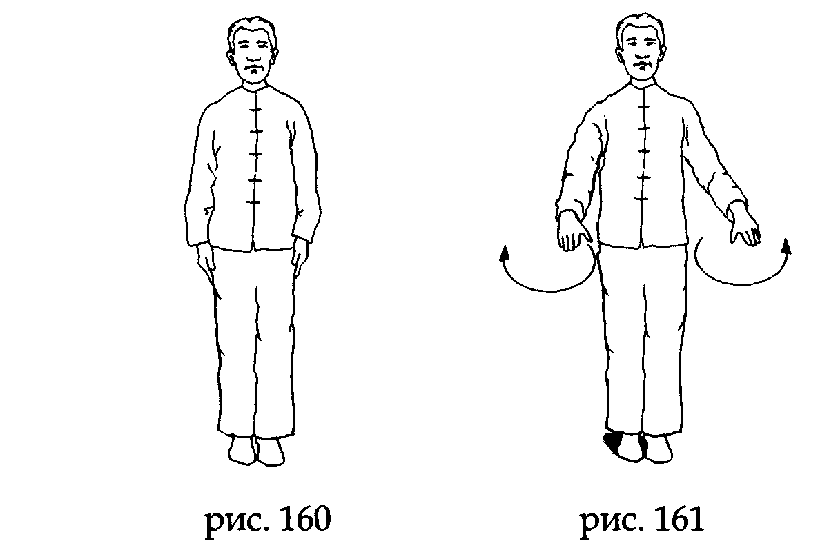 Одновременно с подъемом рук усилием макушки оторвите пятки от земли и поднимитесь на носки, начиная разводить ладони в стороны круговым движением (рис. 160,161).