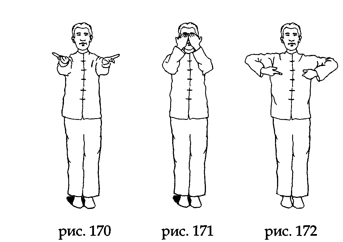 Задержитесь в этом положении и сосчитайте до трех. Лучики энергии-ци, исходящей из кончиков средних пальцев, должны соединиться в области сердца (рис. 170,171,172).