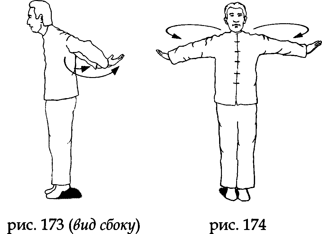 На вдохе руки ладонями вверх вытяните назад за спину. Одновременно с этим поднимитесь на носки. Продолжая вдох и не меняя положение ладоней, переместите руки по кругу в стороны до уровня плеч, локти обращены вверх (рис. 173,174).