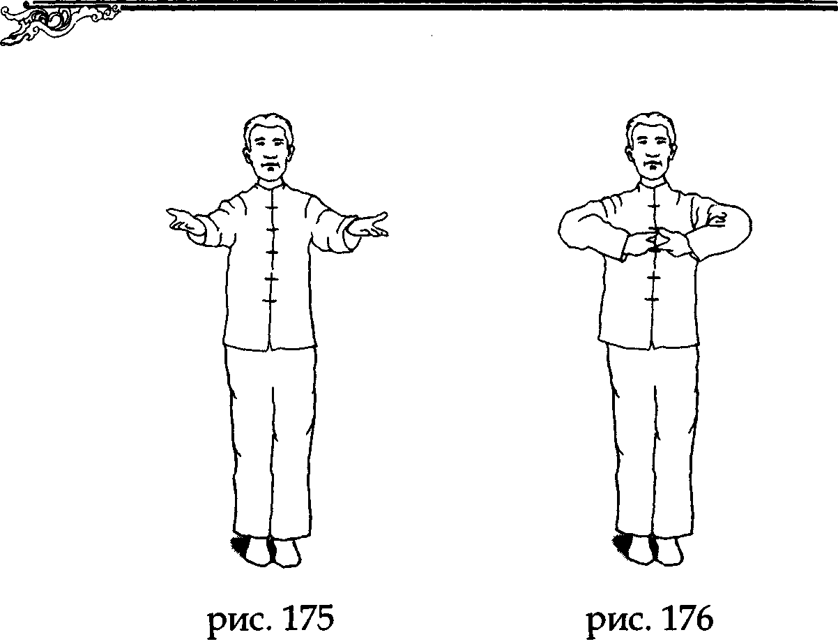 Переверните руки локтями вниз, тогда ваши ладони снова окажутся обращенными вверх и продолжайте движение рук вперед по кругу к области груди. На задержке дыхания направьте кончики средних пальцев на точку данъчжун, задержитесь в этом положении и сосчитайте до трех. Ладони остаются обращенными вверх (рис. 175,176).