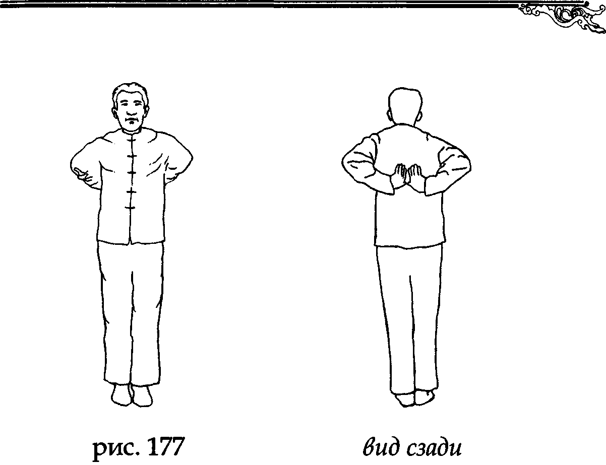На выдохе, не отрывая кончики пальцев от поверхности тела, переместите их на точку линтай. Одновременно с этим опуститесь на пятки. Задержитесь в этом положении и сосчитайте до трех (рис. 177).