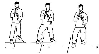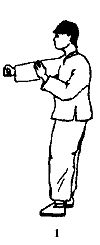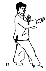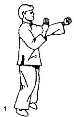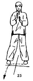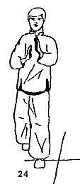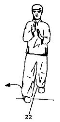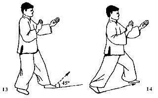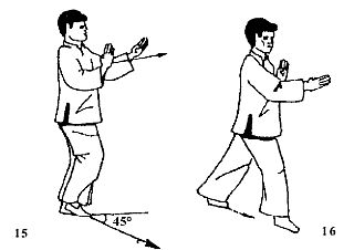 Выполните передней ногой шаг по углом 45° к линии соединяющей Ваши пятки или к фронтальной линии. Перенесите вес тела на левую ногу и подтяните правую к левой (рис. 14, 15).