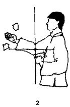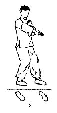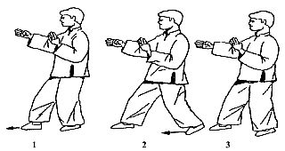 2. Не меняя положения рук, следует сделать полный шаг вперед правой ногой (рис. 2) и затем пол-шага левой ногой (рис. 3).