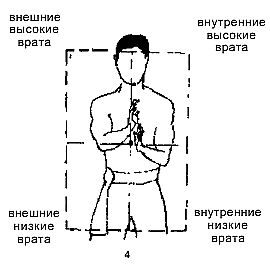 Четыре угла разделены на четыре равные площади или врата (мэнь). Например верхняя половина со стороны выдвинутой вперед руки – внешние высокие врата.