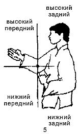 Любая атака в передний район блокируется рукой, выдвинутой вперед, в задний район – рукой, расположенной сзади.