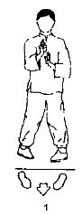 В данной стойке вес тела равномерно распределен на обе ноги, колени немного согнуты и направлены внутрь. Положение стоп напоминает форму треугольника – носки внутрь, пятки врозь. Расстояние между серединами стоп – ширина плеч. Таз немного подан вперед. Туловище выпрямлено. Голова на одной линии с телом (рис. 1).