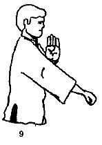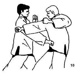 Наносится по центральной линии с полным выпрямлением в локте в конечной фазе. Кулак принимает горизонтальное положение, пальцы смотрят вниз. Ударной поверхностью служат костяшки указательного и среднего пальцев (рис. 9).