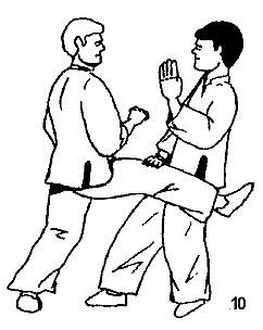 Рука полностью выпрямлена. Ладонь раскрыта, пальцы направлены в сторону. ГУМ САУ применяется как сбивающий блок, так и как останавливающий блок. Используется против любых атак в нижнюю часть туловища (рис. 10).