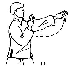 Рука полностью распрямлена, ладонь раскрыта, пальцы направлены вперед вверх. Движение выполняется снизу вверх по дуге. ФАК САУ используется для защиты от прямых ударов в голову, а также для раскрытия противника (рис. 12).