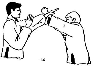 Рука полностью выпрямлена. Пальцы направлены вперед вверх и продолжают линию проходящего вдоль всей руки. Как блок БИЛ САУ применяется против прямых ударов в голову (рис. 14).