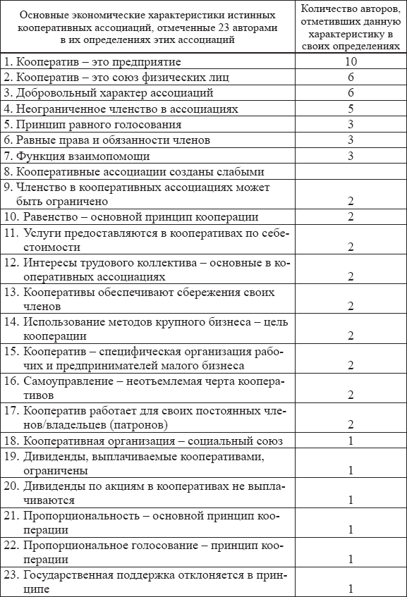 Каждое определение содержит некие основные характеристики, признаки или принципы истинной кооперативной организации: 46 таких основных признаков кооперативных ассоциаций упоминаются в 23 определениях, предложенных авторами, упомянутыми выше. Большинство признаков указано лишь одним или двумя авторами, и лишь немногие из них выделены более чем пятью интерпретаторами каждый, как это показано далее в таблице.