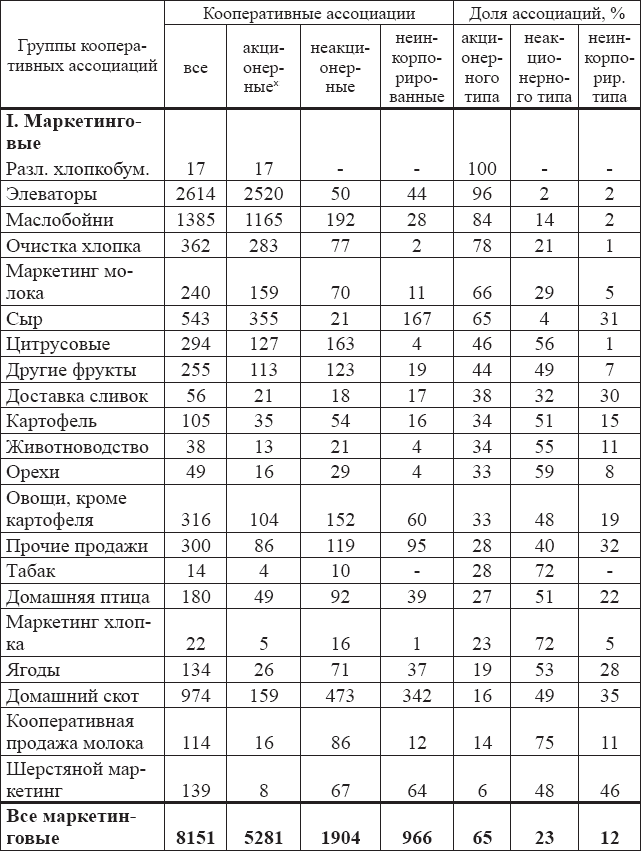 Согласно специальному исследованию различных этапов кооперативного движения в США, проведенному Администрацией по делам фермерского кредита (АФК), в 1935–1936 годах в США насчитывалось 10 752 фермерских кооперативных маркетинговых и закупочных организаций, из которых 68 % (7300 ассоциаций) составляли акционерные кооперативы, 22 % (2375 ассоциаций) были неакционерными, некоммерческими структурами и 10 % (1077 ассоциаций) – неформальными неинкорпорированными организациями.