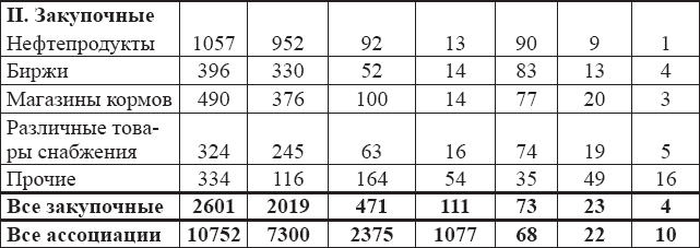 Таблица на следующей странице показывает, что доля акционерных и неакционерных ассоциаций сильно варьируется в разных группах рассматриваемых ассоциаций. Кооперативы акционерного типа обычно, хотя и не обязательно, более многочисленны в тех областях экономической деятельности, где требуются значительные вложения капитала (элеваторы, маслозаводы и т. д.), и где такой капитал не может быть мобилизован в каких-либо других областях, тогда как неакционерный, некоммерческий вариант лучше адаптирован к организациям, где потребность в значительных средствах не актуальна. Тип акционерных ассоциаций охватывает широкий круг кооперативных образований. Самым представительным и занимающим видное место в истории кооперативного движения является кооперативный магазин, созданный Обществом равноправных (справедливых) пионеров Рочдейла[130]130