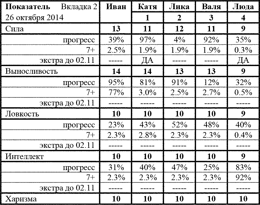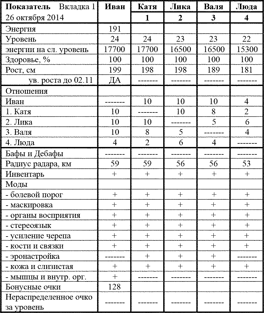 Оставив это без комментариев, я предложил начать. Энергию я потратил так, как мы ещё в понедельник и планировали. Себе я заказал последний сантиметр роста, а Уровень поднял Кате и Люде, Энергия 191 (-500, -16 500, -14 100). Очки я вложил обеим девушкам в Силу.