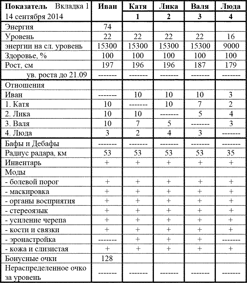 Вечером, отдохнув после фарма, мы распределили Энергию. Как и на прошлой неделе, я поднял Уровни Лике и Люде, Энергия 74 (-14 100, -8 100). Аналитику я вложил Очко снова в Ловкость, а хилерше в Выносливость. Люда, «погуляв» сегодня по тайге, очень настаивала именно на этом Параметре, прекрасно увидев, как сильно тормозит наше перемещение.