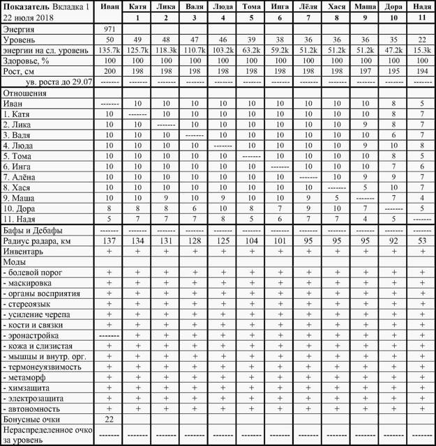 Смайл заранее предупредил, что в дальнейшем увеличение Уровней у Доры будет куда медленнее, чем было до этого. Так как она почти догнала по этому показателю Алёну, Хасю и Машу, то это не сильно напрягает. Больше волнует прогресс самой отстающей, Нади. Но идти поперёк воли Симбионта, запрещающего мне развивать активней именно баффершу, было глупо.