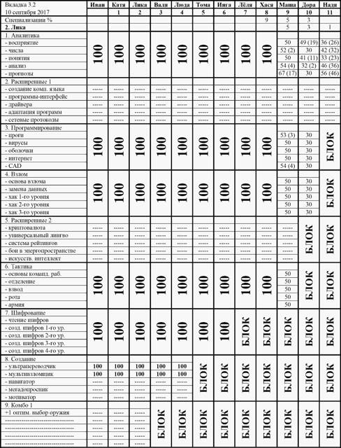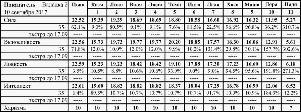 Вышло, что почти все усилия ей предстоит уделять тоже Интеллекту. Когда он выровняется с её Выносливостью, дамагерша переключится на свою Ловкость. Было бы неплохо того же добиться и для новенькой, но у неё сейчас слишком сильное отставание от всех.