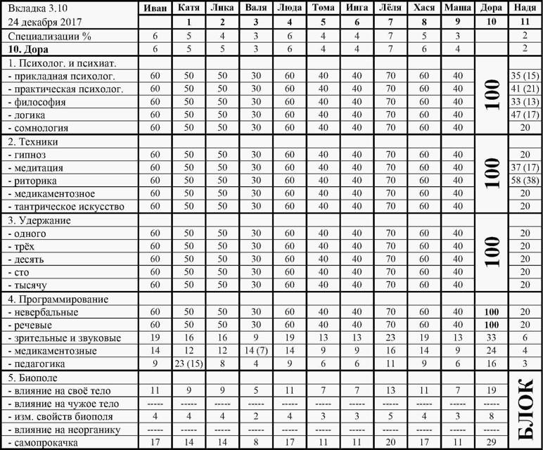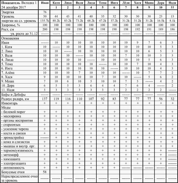 У зельеварши новая, седьмая группа Умений отвечала за создание Защитных покрытий. Они тоже, по сути, были Комбо, дополняя Навыки Хаси по изготовлению Брони. Помимо Люды и Маши, у Нади Уровень тоже был пороговым. Её новая четвёртая Специализация отвечала за создание Музыкальных произведений. Надеюсь, разбираясь с тем, как освоить в будущем всё это добро, жёны смогут помочь и затупившей бафферше. Ведь Новый Год становится всё ближе.