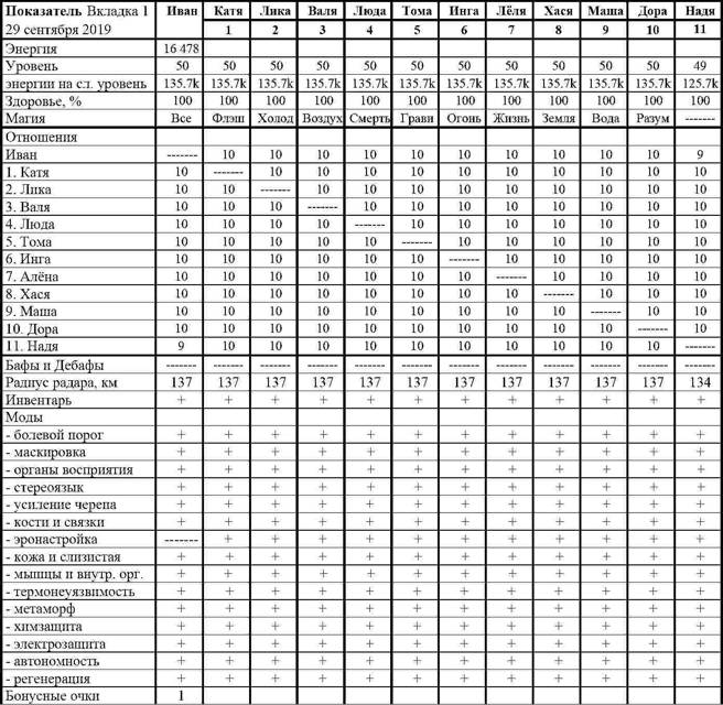 Во время «диспансеризации», я радовался не только процессу, но и цифрам в Интерфейсе. Таблица Отношений сейчас была заполнена сплошными десятками. Этим утром моя Синхронизация с баффершей достигла капа. Было обидно, что мне всего пары дней не хватило, чтобы это произошло раньше, чем у Нади с Дорой.