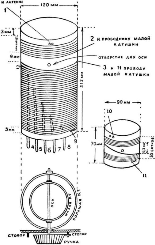 Состоит он из двух катушек. Цилиндры (каркасы) их склеиваются из тонкого картона на болванках или бутылках подходящих размеров. Проволока для намотки берется звонковая или ПБД, диаметром 0,8 миллиметра (ПБД означает, что оболочка провода простая, бумажная, двойная). Число витков и места отводов показаны на рисунке.