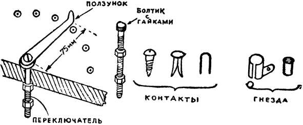 Переключатели с ползунком, контакты и гнёзда сделать легче. Как и из чего их можно сделать, показано на рисунке 3.