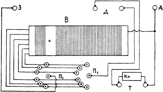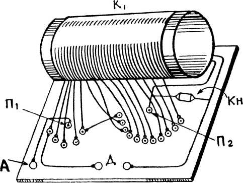 Проследим, как можно изменять число включённых витков. Если антенну А посредством подвижного переключателя П1 присоединим к контакту 1, а переключатель П2 к контакту 6, то будет включено 200 витков. При перестановке переключателя П2 на контакты 7, 8, 9, 10 и так далее будет прибавляться по 5 витков и при соединении с контактом 16 будет включена вся катушка – 250 витков. Если антенну присоединить переключателем П1 к контакту 2, то будет включено 200 витков. Переставляя переключатель П2 на контакты 15, 14 и прочие, мы будем каждый раз уменьшать число витков на 5. Самое малое число витков будет включено при присоединении переключателя П1 к контакту 5, а переключателя П2 к контакту 7. В цепь будет включено всего 5 витков.
