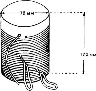 Остов катушки (рисунок 7) делается цилиндрической формы, диаметр его 72 миллиметра и длина 120 миллиметров. В качестве болванки удобно применить полулитровую бутылку, наружный диаметр которой 70 миллиметров.