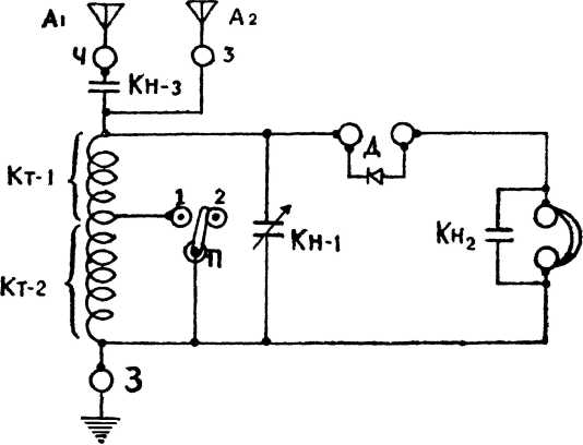 Она состоит из катушек Kт1 и Кт2 и конденсатора переменной ёмкости Kн1. К этой цепи присоединятся детектор Д, телефон Т и конденсатор постоянной ёмкости Кн2.
