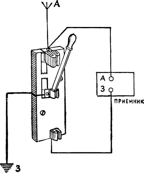 В середине на пружинящей скобочке укрепляется нож рубильника, который можно за ручку поднимать или опускать. К нему приключается провод, идущий непосредственно от заземления. Верхний зажим грозового переключателя соединяется с антенной, которая прямо от него идёт к антенне приёмника (гнездо А). Нижний зажим соединяется с гнездом 3 (заземление) приёмника.