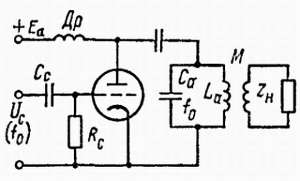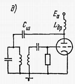 Анодное напряжение подводится через дроссель высокой частоты, а резонансный контур развязан от анода конденсатором. Передача мощности в нагрузку осуществляется обычно на принципе использования индуктивной связи. Одновременно эта связь служит для энергетического согласования нагрузки с лампой.