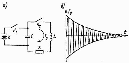 Рассмотрим резонансный (колебательный) контур, представленный на рис. 10.1, а. Предположим, что конденсатор С заряжен до напряжения батареи Б. Допустим, что конденсатор разряжается через катушку индуктивности после размыкания ключа К1 и замыкания ключа К2. При разряде конденсатора через катушку энергия электрического поля конденсатора переходит в энергию магнитного поля катушки. В результате явления самоиндукции в катушке возникает электродвижущая сила, которая поддерживает ток в контуре и перезаряжает конденсатор. В свою очередь конденсатор снова разряжается через катушку, и процесс повторяется сначала. Если бы контур был идеальным (без потерь), колебания в контуре имели бы чисто синусоидальную форму и длились бы бесконечно долго.