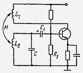 Характерной особенностью этого генератора являются две катушки, из которых одна совместное подключенным параллельно конденсатором образует колебательный контур. Конденсатор может быть подключен к катушке в цепи базы либо в цепи коллектора. Вторая катушка является катушкой связи, ее задача состоит в передаче части энергии с выхода на вход схемы. Обратная связь в схеме должна быть положительной. Будет ли ОС положительной, зависит от относительного направления навивки катушек. В общем можно принять, что если катушки навиты в одном направлении, то одна из них должна иметь обращенные концы. Степень ОС зависит от взаимной индуктивности М между катушками. Рост M, а следовательно, и коэффициента связи χ вызывает увеличение ОС.