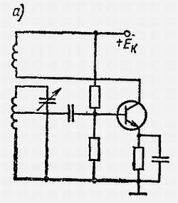 На рис. 10.3 изображено несколько вариантов схем. Особого внимания заслуживает схема на рис. 10.3, а, в которой база транзистора питается переменным напряжением с части обмотки катушки резонансного контура. Такое включение предотвращает демпфирование резонансного контура транзистором.