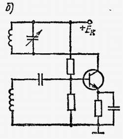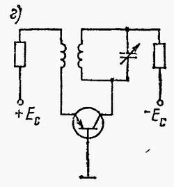 а – с контуром в цепи базы транзистора; б – с перестраиваемым контуром в цепи коллектора и последовательным питанием; в – схема с параллельным питанием; г – генератор по схеме с ОБ; д – ламповый генератор с параллельным питанием