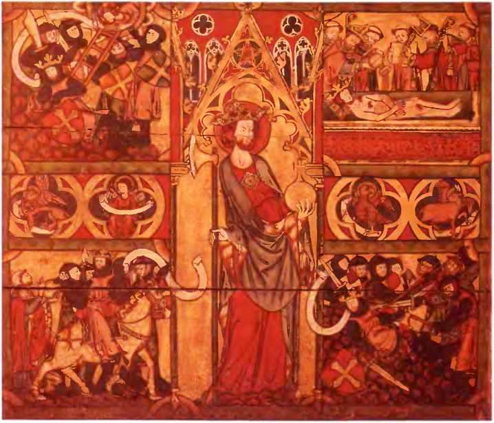 Расписная деревянная панель XIV столетия с изображением Олафа II Харальдссона, правившего в Норвегии с 1015 по 1030 г. В центре композиции изображен король с державой и боевым топором – с двумя важнейшими символами самодержавной власти. Жестокие методы, с помощью которых данный монарх насаждал христианство, вызвали недовольство и в итоге бунт подданных, что привело к гибели его в битве при Стиклестаде в 1030 г. Довольно скоро короля стали почитать как мученика святого Олафа Норвежского.
