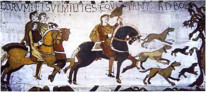 На одной из первых сцен вышивки из Байе именитый эрл (earl в Англии то же, что и ярл в Скандинавии. – Прим. nep.) – в данном случае Гарольд Годвинссон – скачет на охоту с ястребом на руке. На нем отличного качества рубаха и плащ, под ним дорогой конь с подстриженной или заплетенной гривой. Сопровождаемый свитой Гарольд посылает псов травить зверя, в роли которого выступают, по всей видимости, зайцы. Подобная сцена вполне могла бы быть подсмотрена и где-нибудь в Скандинавии, где место английского эрла занимал бы в таком случае ярл-викинг.