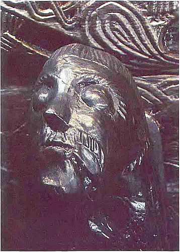 Одна из четырех резных деревянных голов из Усеберга. Обычно портретные изображения эры викингов весьма стилизованы, это же, однако, подлинно натуралистическое. Весьма ухоженный муж довольно высокого положения как будто бы настороженно взирает на нас из эпохи, между которой и нами пролегает по меньшей мере тысячелетие. Думается, более правдивого облика северянина-скандинава и бонда мы не получим никогда (Музей судов викингов, Бюгдей).