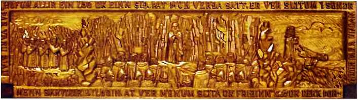 На представленной здесь вниманию читателя резьбе по дереву запечатлены викинги, собравшиеся на ежегодный тинг примерно в 1000 г. от Р.Х. На этой ассамблее они, скорее всего, обсуждают вопрос приема христианства. В самом правом фрагменте работы вождь свергает языческих идолов.