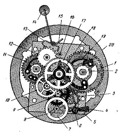 Рис. 166. Механизм будильника: 1 – заводное колесо хода; 2 – храповое колесо, 3 – ходовое колесо с трибом; 4 – якорь; 5 – противовес анкера; 6 – ось анкера; 7 – спираль; S__баланс; 9 – секундное колесо с трибом; 10 – промежуточное колесо с трибом; 11 – заводное колесо боя; 12 – скобочное колесо с трибом; 13 – скобка молотка; 14 – молоток; 15 – короткий стержень молотка; 16 – сигнальный валик; 17 – центральное колесо; 18 – фрикционная пружина; 19 – пружина собачки; 20 – собачка