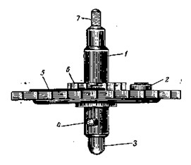 Рис. 172. Заводное колесо хода: ! – вал заводного колеса; 2 – собачка; 3 – нижняя цапфа вала; 4 – крючок для внутреннего конца пружины; 5 – пружинка собачки; 6 – храповое колесо; 7 – резьба для ключа