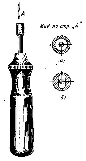 Ремонт будильников начинают с разборки и определения дефектов. Вынув механизм из корпуса, снимают стрелки. Сигнальную стрелку нельзя поворачивать, так как можно согнуть или сломать сигнальный штифт, а, слегка покачивая из стороны в сторону, нужно тянуть ее на себя. Для отвертывания и завертывания шайбы головки малогабаритных будильников, закрепляющей механизм в корпусе, рекомендуется фасонная отвертка (рис. 177).