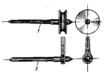 1. Стальная, полированная ось баланса (рис. 167), заостренная с двух концов, имеющая в центре паз. Ось вращается в двух стальных центровых винтах, имеющих тщательно отполированное коническое углубление и ввинченных в переднюю и заднюю платины. Существуют также будильники, в центровых винтах которых закреплены камни.