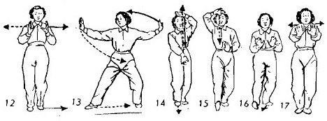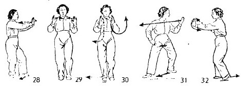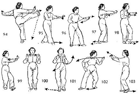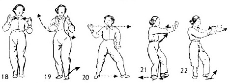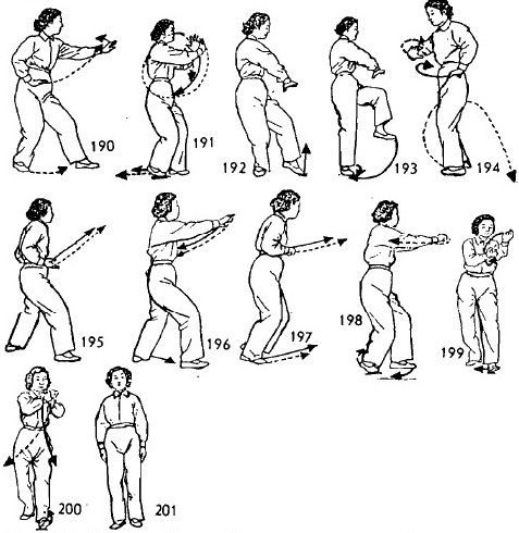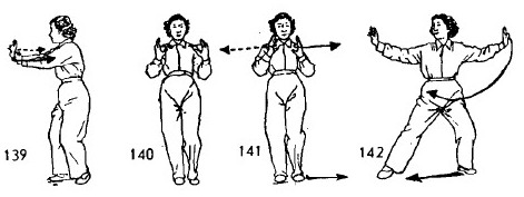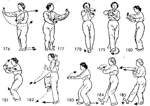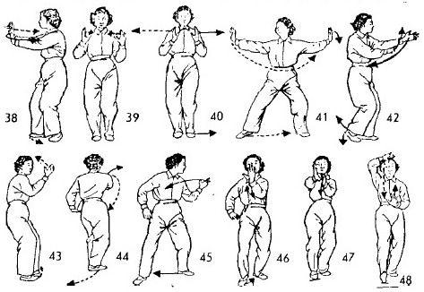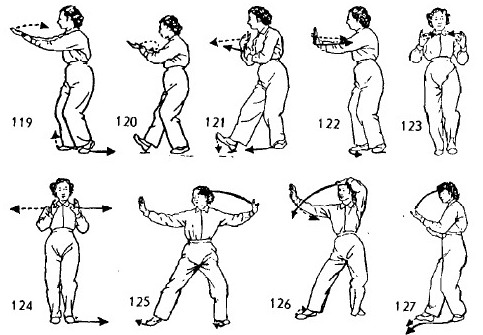 Упр. 19, 20. Раскрытие и закрытие рук. Кай шоу, хэ шоу. Рис. 39, 40. Упр. 21. «Одиночный хлыст». Дань бянь. Рис. 41. Упр. 22. Удар под локоть. Чжоу ся кань чуй. Рис. 42.