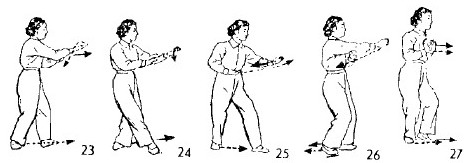 Упр. 12. В движении отклонить удар партнера и нанести ответный удар. Цзинь бу баньлань чуй.Рис. 23-26'