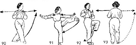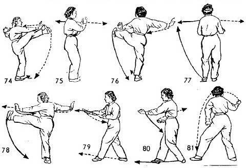 Упр. 38-40. Поднятие правой ноги, поднятие левой ноги, поднятие ноги с поворотом тела. Ю ци цзяо, цзо ци цзяо, чжуань шэнь ти цзяо(три различных удара ногами). Рис. 74, 75, 77, 78.
