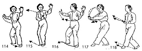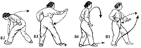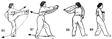 Упр. 42. Двойной удар с разворотом тела. Фань шэнь эр ци. Рис. 83-87.