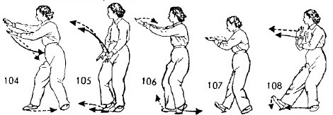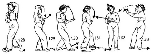 Упр. 51. С шагом обводим ладонью правое колено. Лоу си ао бу.Рис. 102, 103.