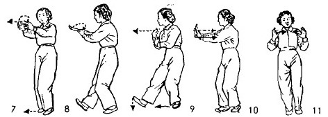 Упр. 41. Двигаться и вместе с шагом наносить удары. Цзянь бу дачуй.Рис. 79-82.