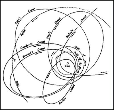 «Оставляя в стороне уже известные кометы, мы постоянно находим появляющиеся из глубин космоса новые кометы, которые движутся вокруг Солнца по орбитам, хорошо демонстрируя силу притяжения этого светящегося тела. По большей части они снова уходят в космос на целые столетия, чтобы вернуться вновь издалека после своего огромного оборота» («The Heavens», p. 251).