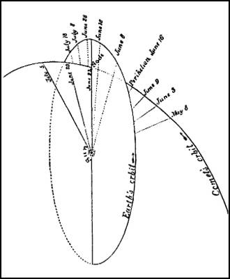 В приведенной нами иллюстрации даются орбита Земли и орбита этой кометы и показывается, насколько близко они приближаются друг к другу. В своей самой близкой точке комета отстояла от Земли только на тринадцать сотых расстояния Земли от Солнца.